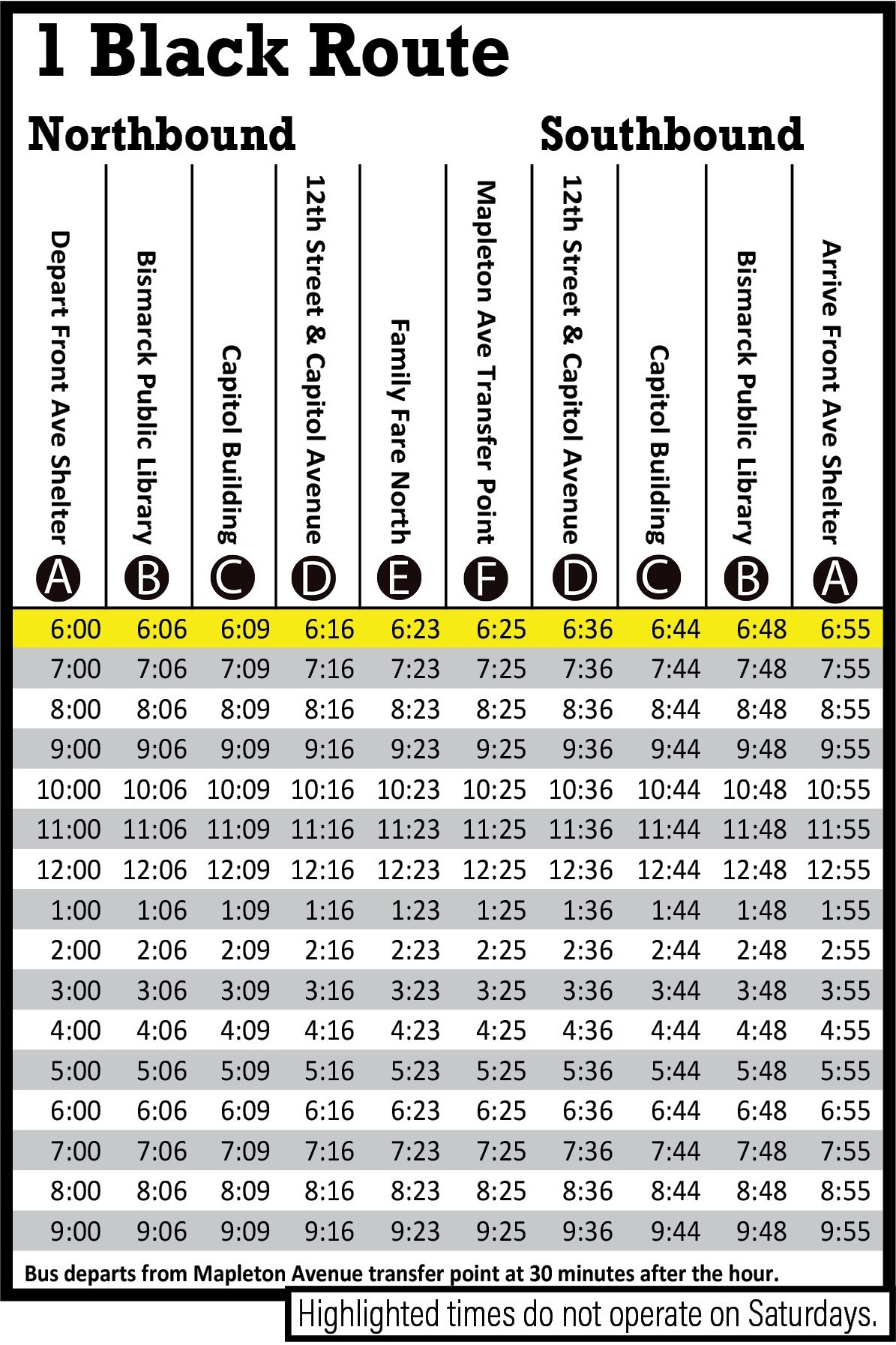 - Major destinations are printed on the top of the schedule and right underneath is a letter in a black circle. These letters and circles are referred to as timing points.