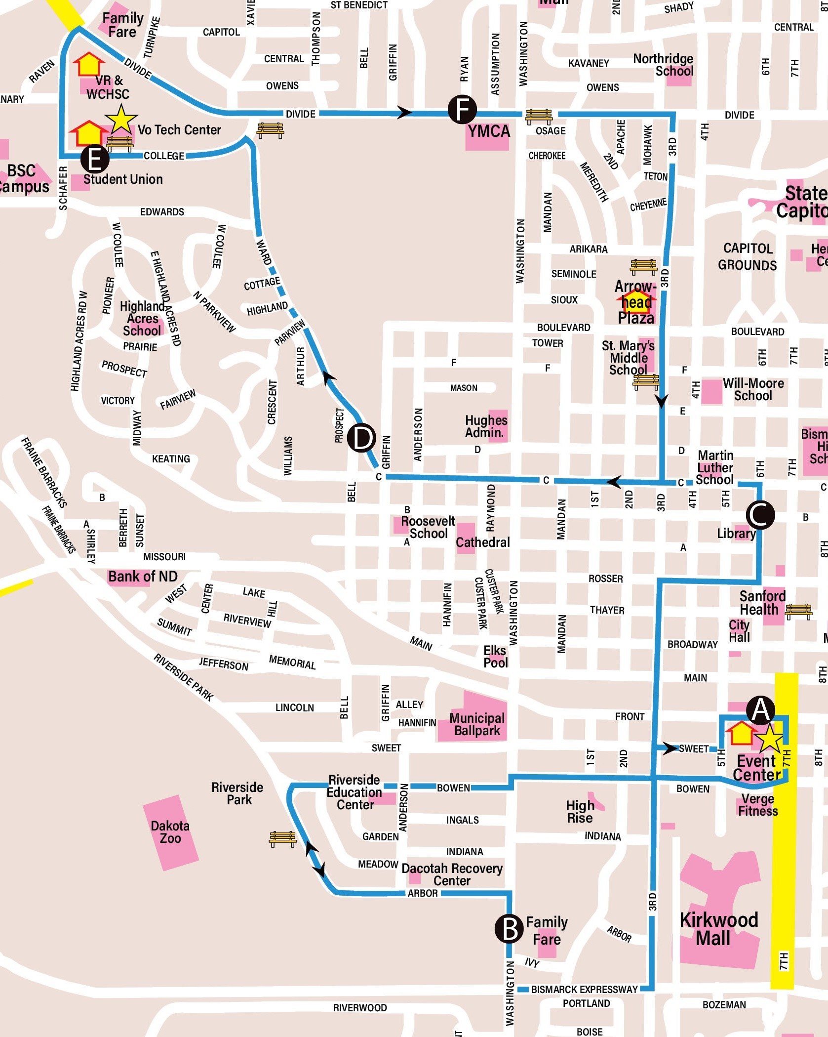 - Major destinations are printed on the top of the schedule and right underneath is a letter in a black circle. These letters and circles are referred to as timing points.