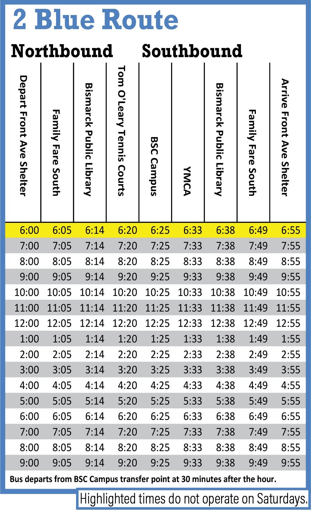 - On the time table, there are times listed under the timing points. These are the estimated times that the bus will be at that timing point (buses do not stop at timing points; you need to wave for the bus to stop).
