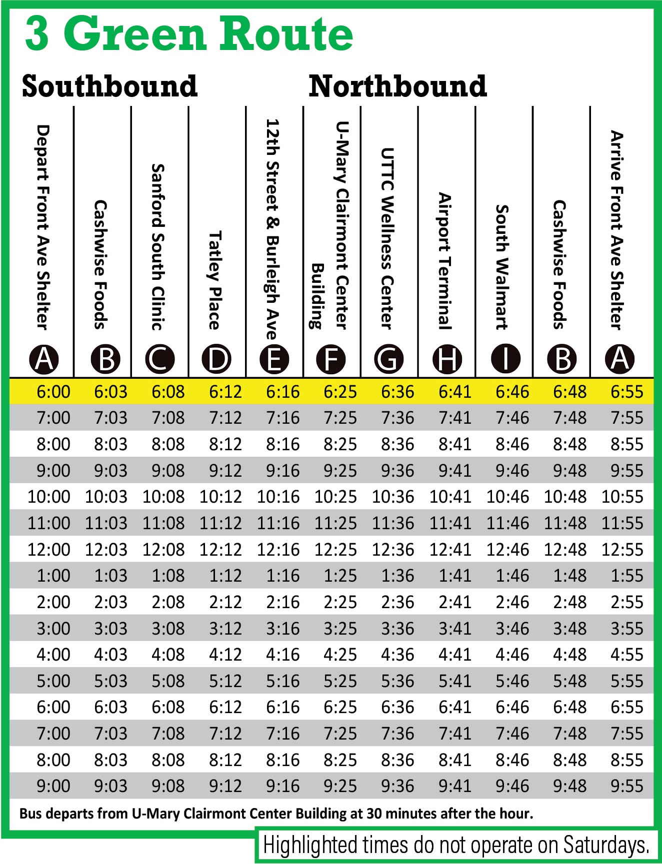 - Major destinations are printed on the top of the schedule and right underneath is a letter in a black circle. These letters and circles are referred to as timing points.