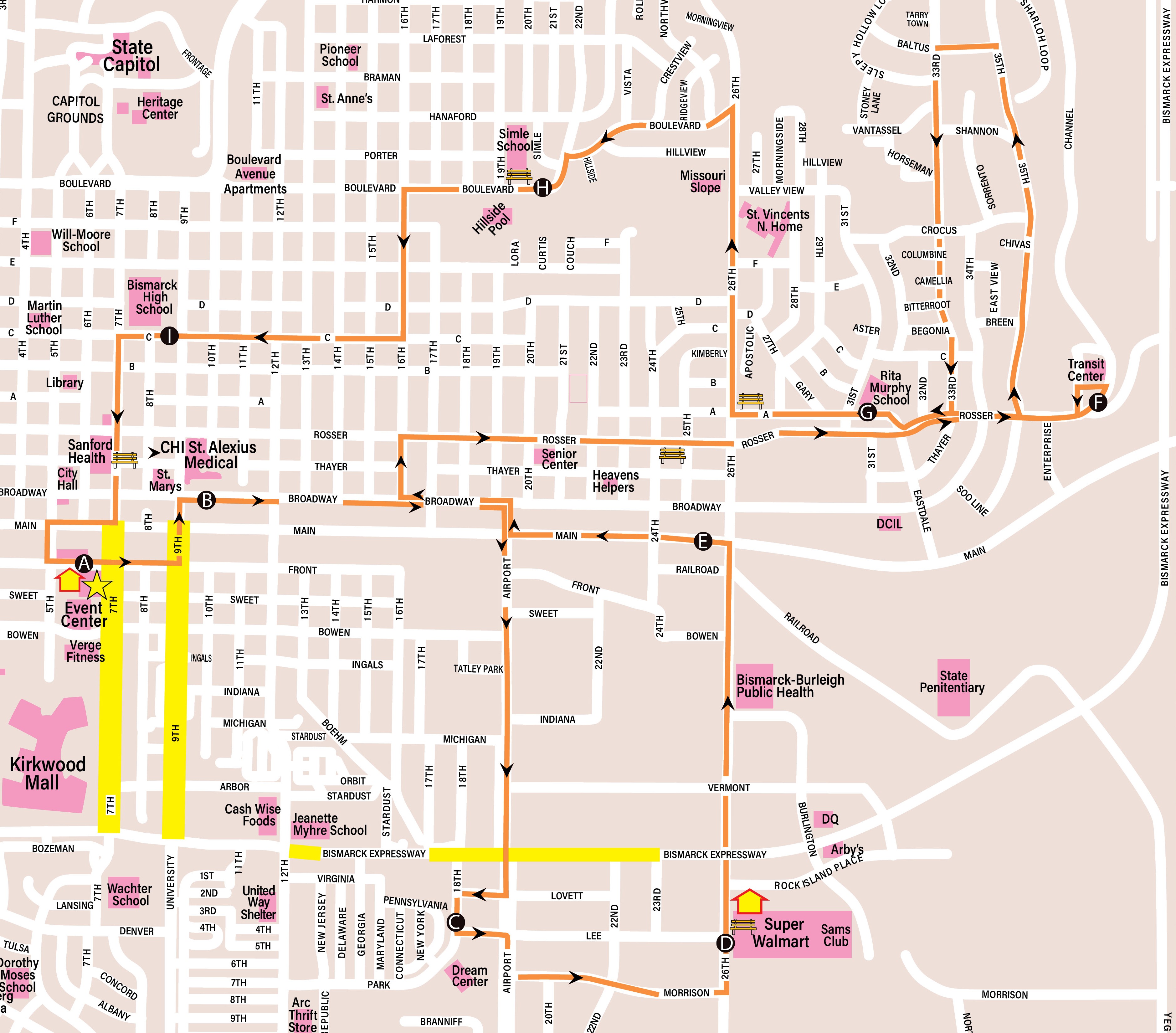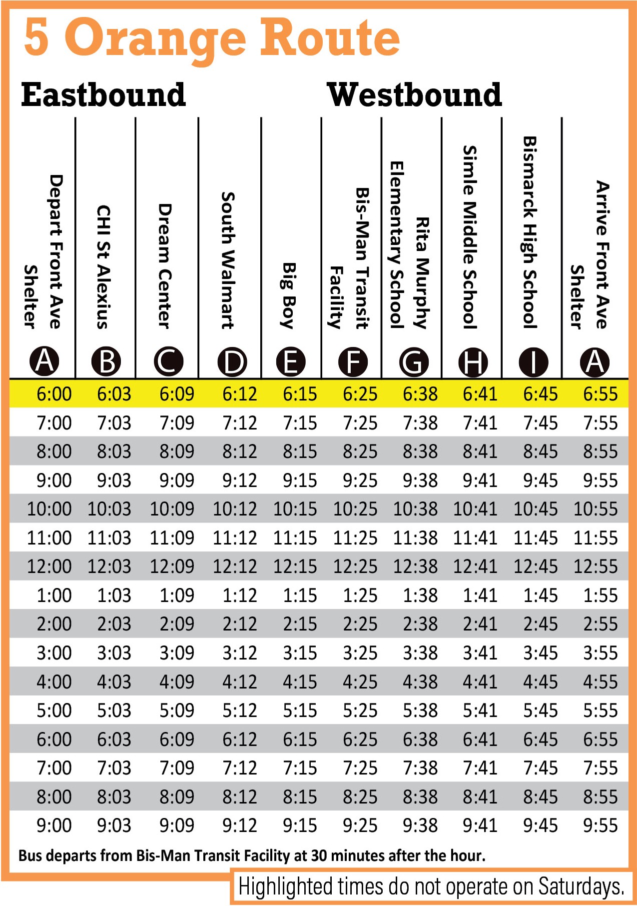 - Major destinations are printed on the top of the schedule and right underneath is a letter in a black circle. These letters and circles are referred to as timing points.