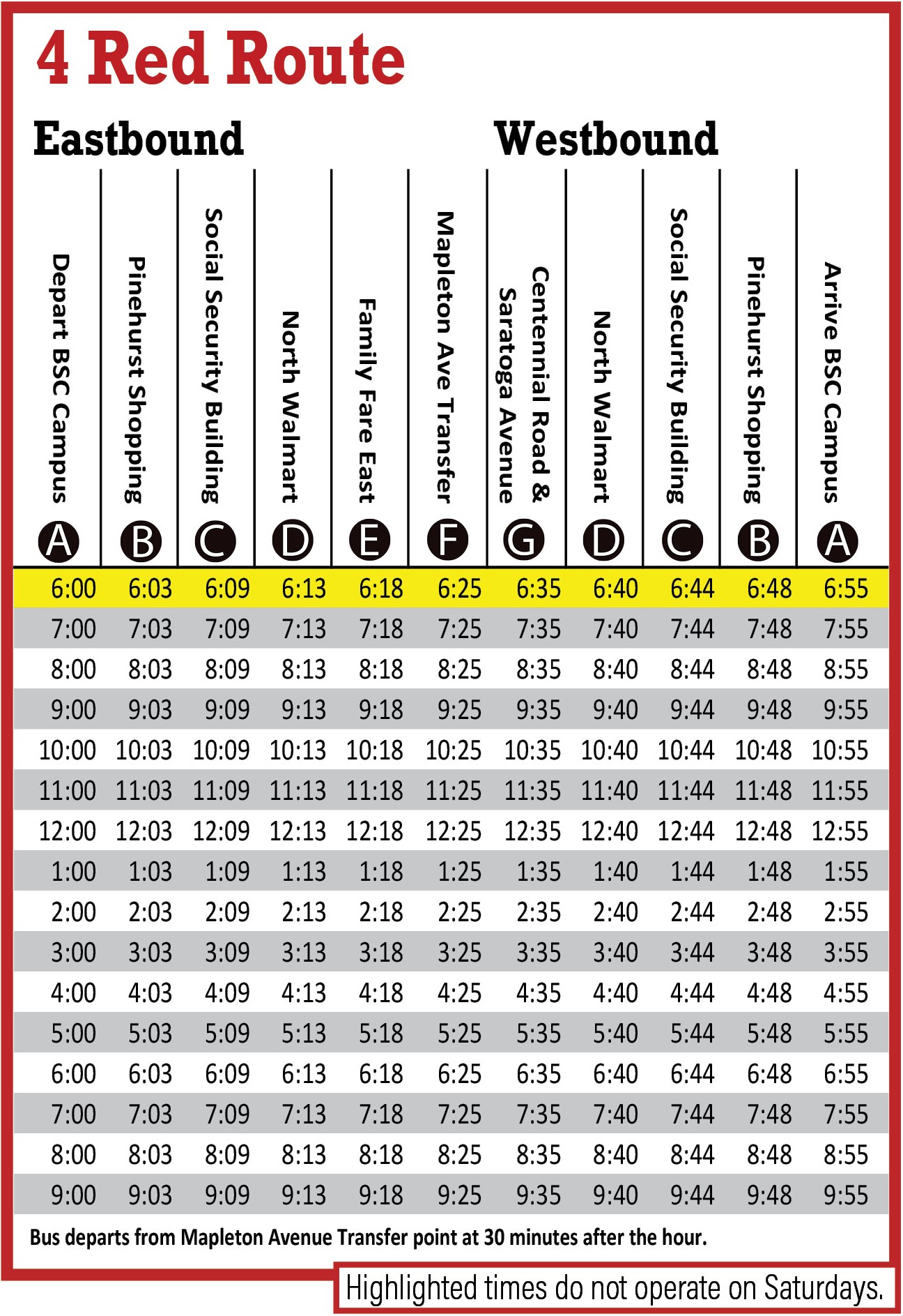 - Major destinations are printed on the top of the schedule and right underneath is a letter in a black circle. These letters and circles are referred to as timing points.