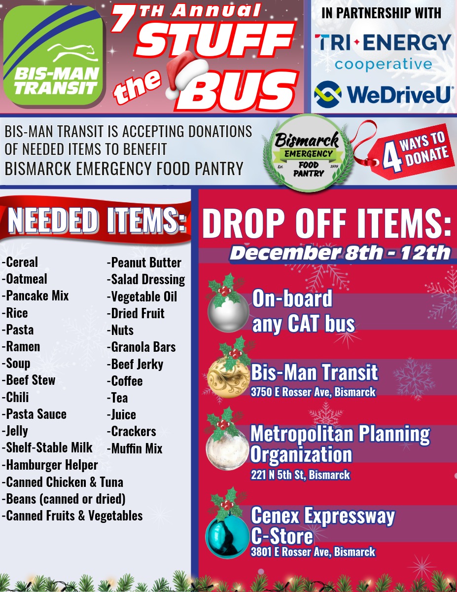 From December 8th - 12th, donations can be dropped off on-board any CAT bus, at the Bis-Man Transit administrative office (3750 East Rosser Ave, Bismarck), at the Metropolitan Planning Organization (221 North 5th St, Bismarck), or at the Cenex Expressway C-Store (3801 East Rosser Ave, Bismarck).